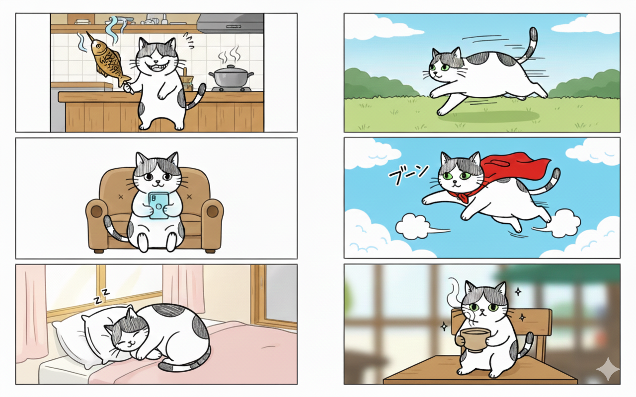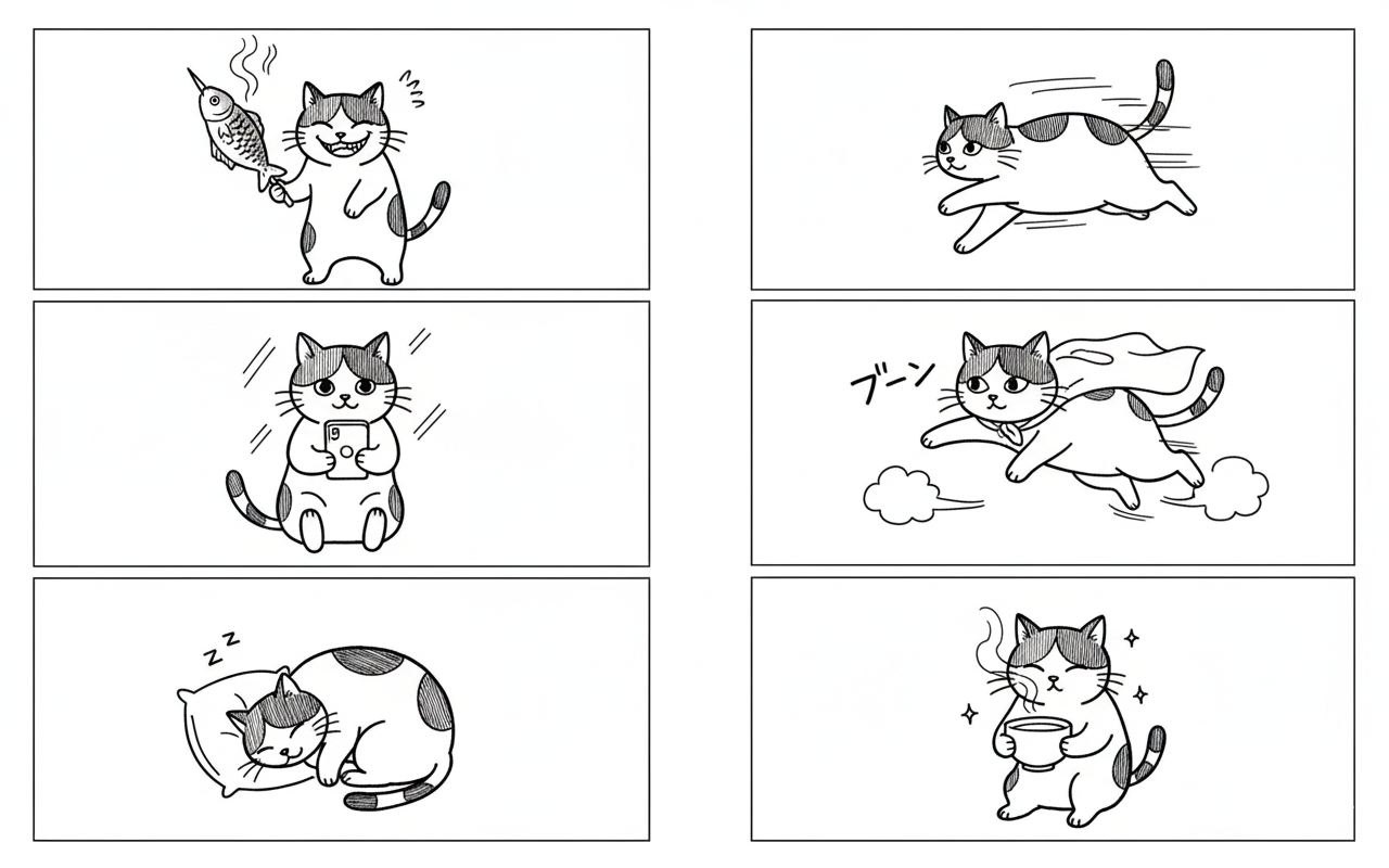 「このイラストをもとに、いろんなアクションをしている猫のイラストをA4用紙の中に6パターン作成してください。」って書いただけ。