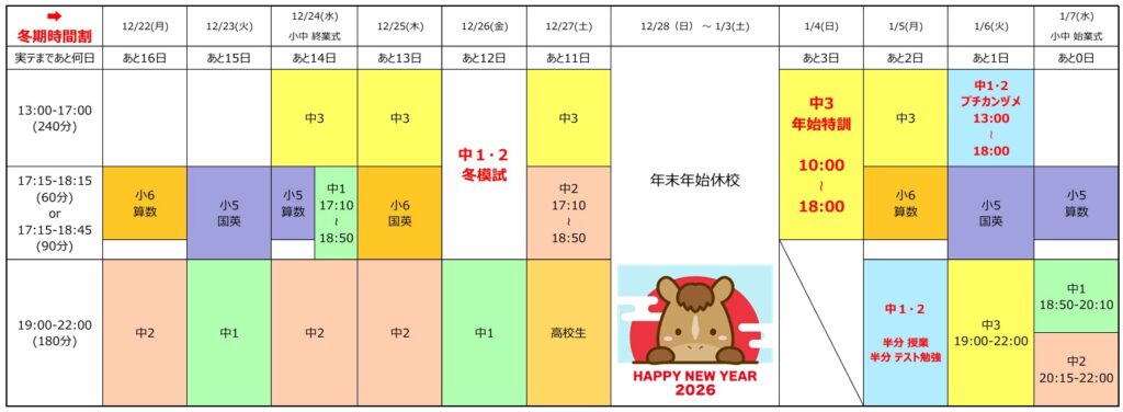 12月28日(日)~1月3日(土)は完全休校です。