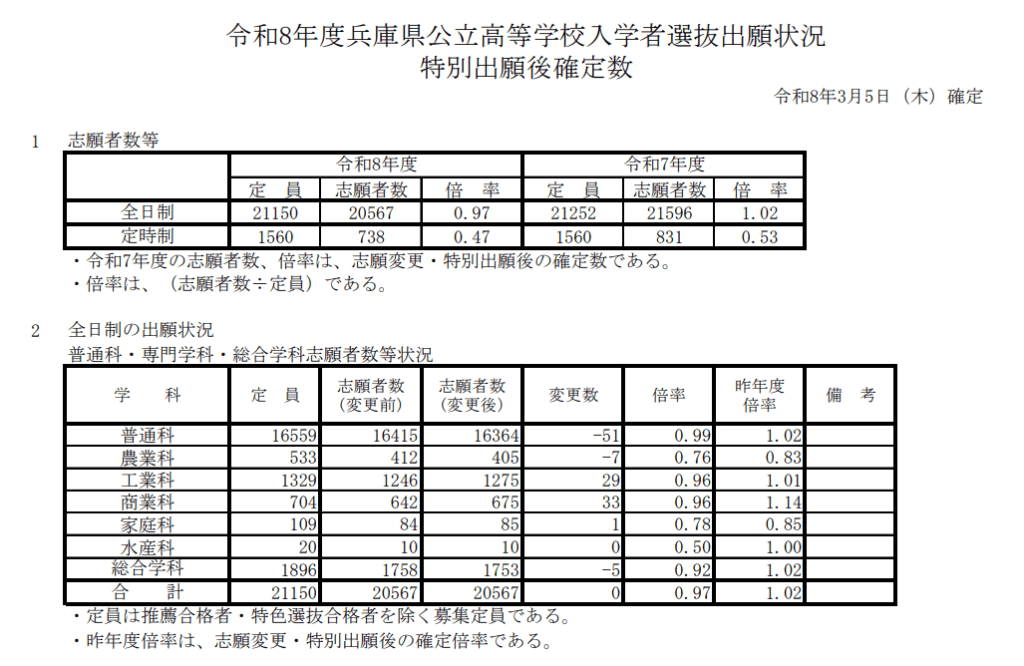 今年の兵庫県公立高校入試の倍率が確定しました。
